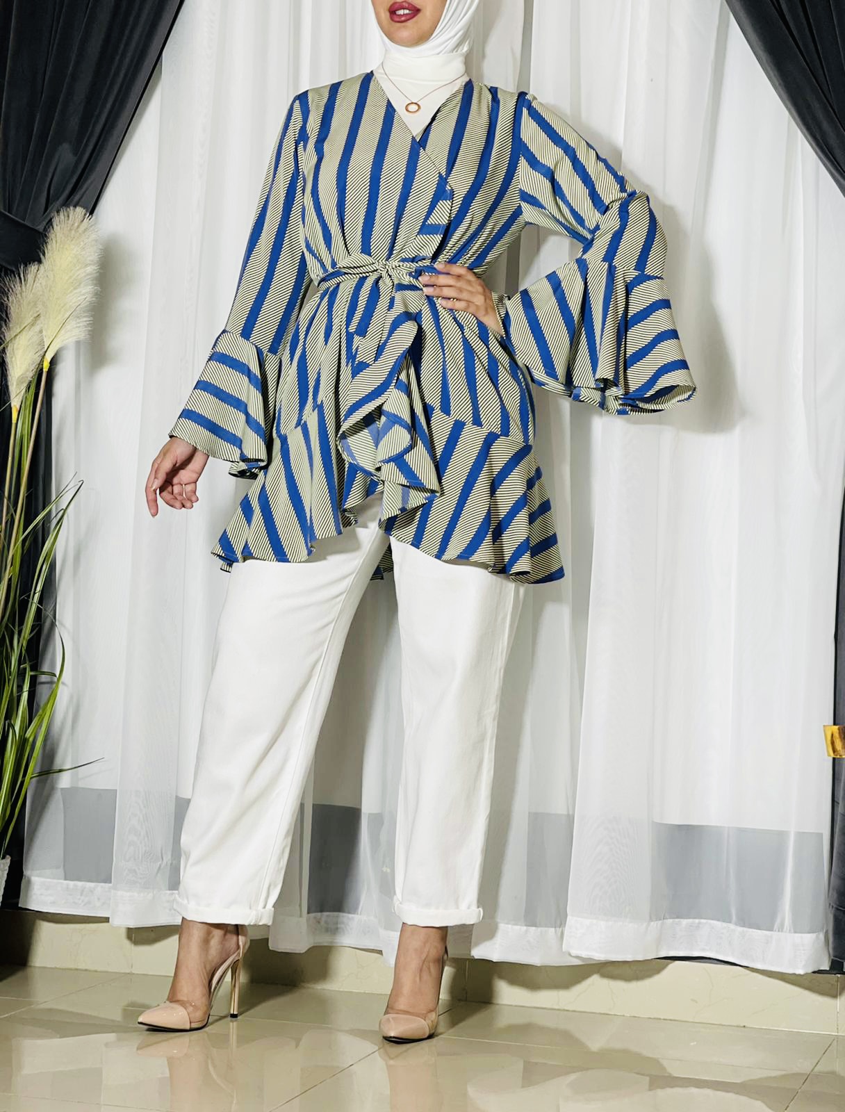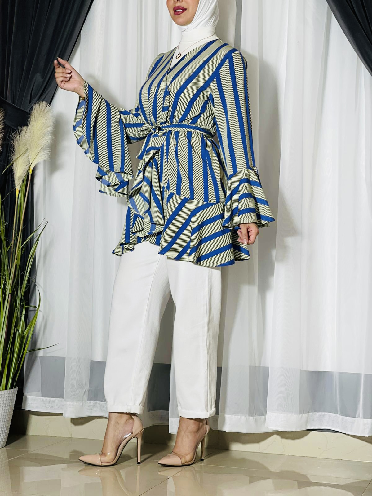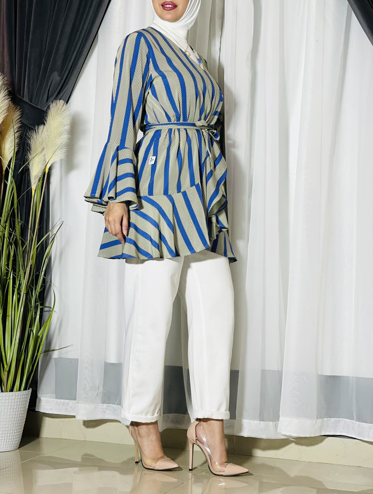 Raffle top with belt. The length of the top is 33 inches