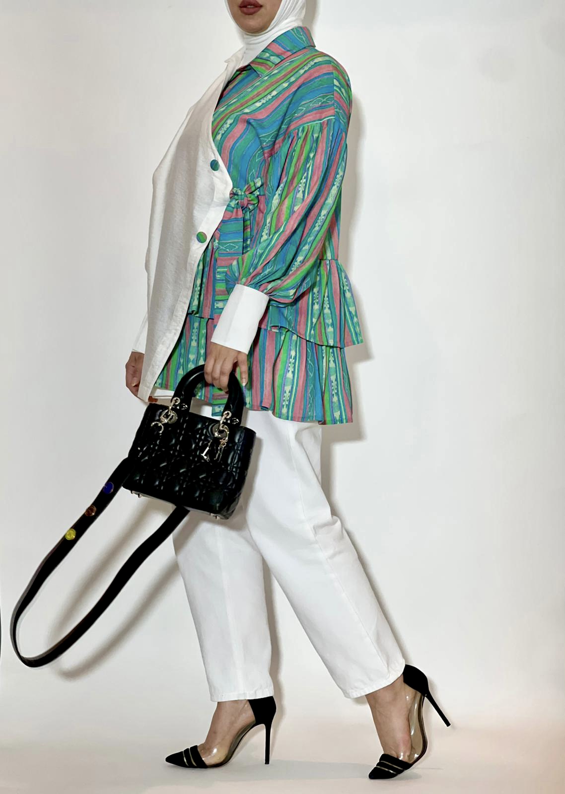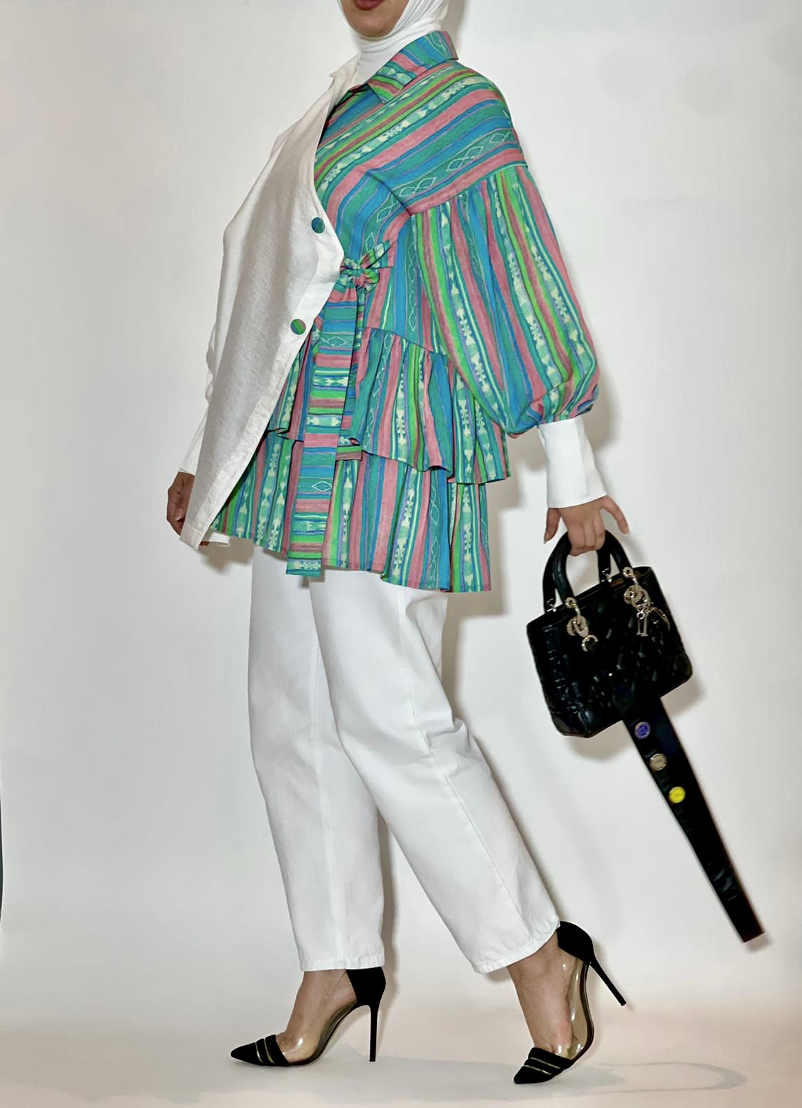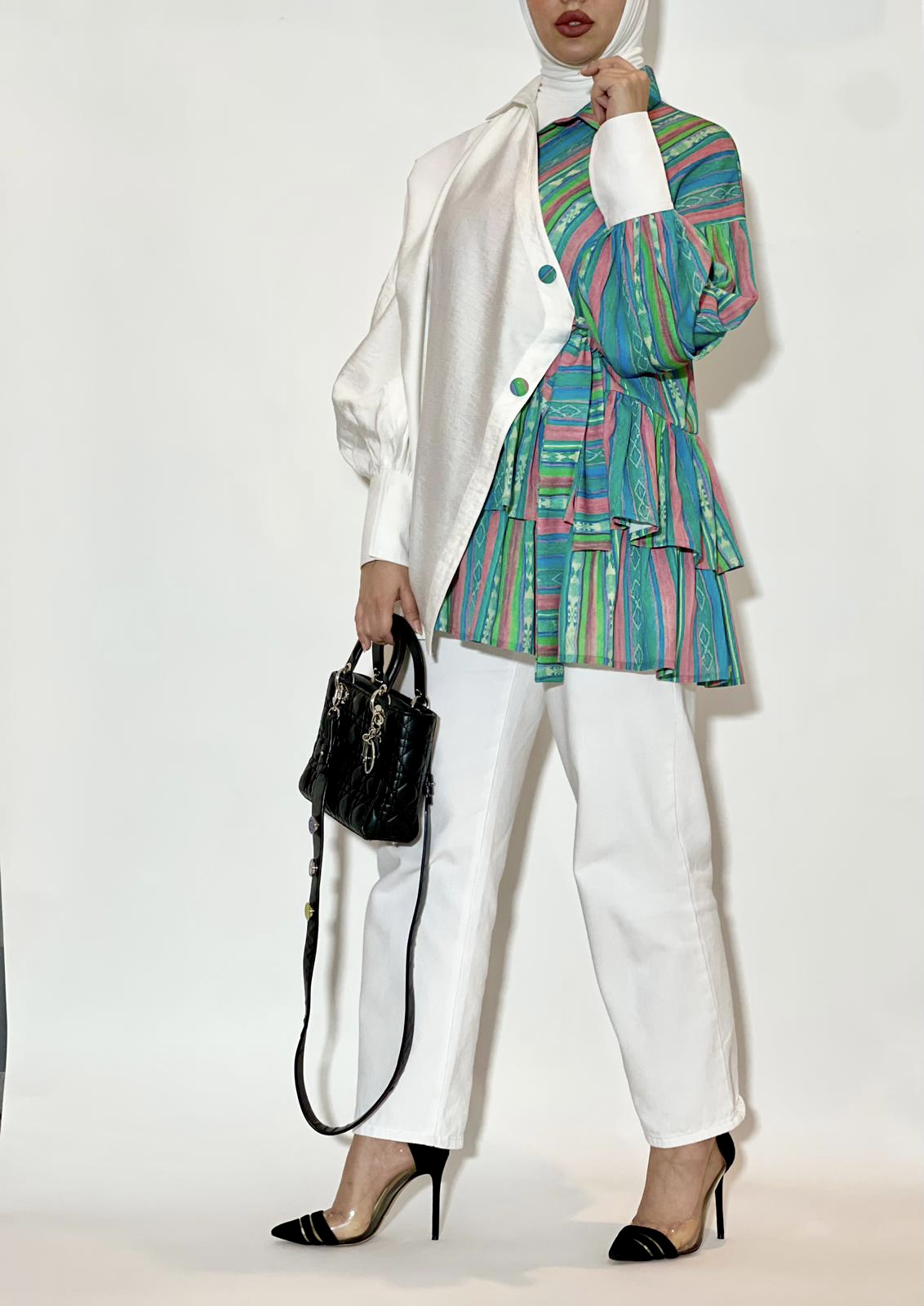 Summer jeans jacket, 35 inches long. Note the white adhesive sleeves to the jacket