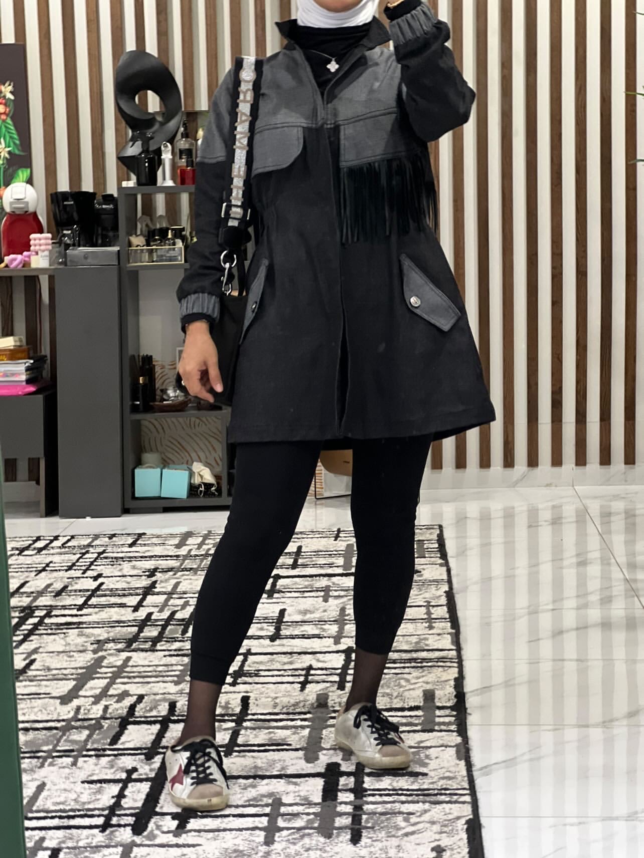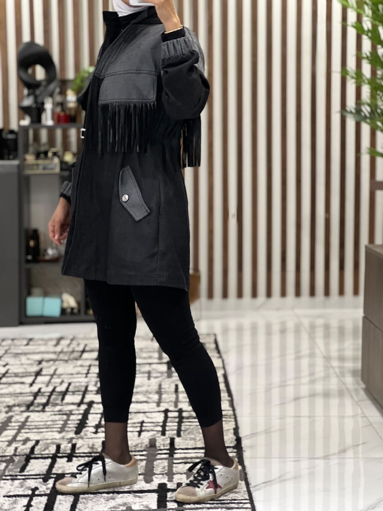 Jacket is available in black. The length of the jacket is 38 inches