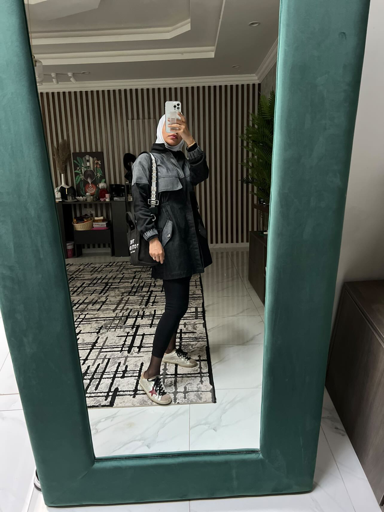 Summer jeans jacket, 35 inches long. Note the white adhesive sleeves to the jacket