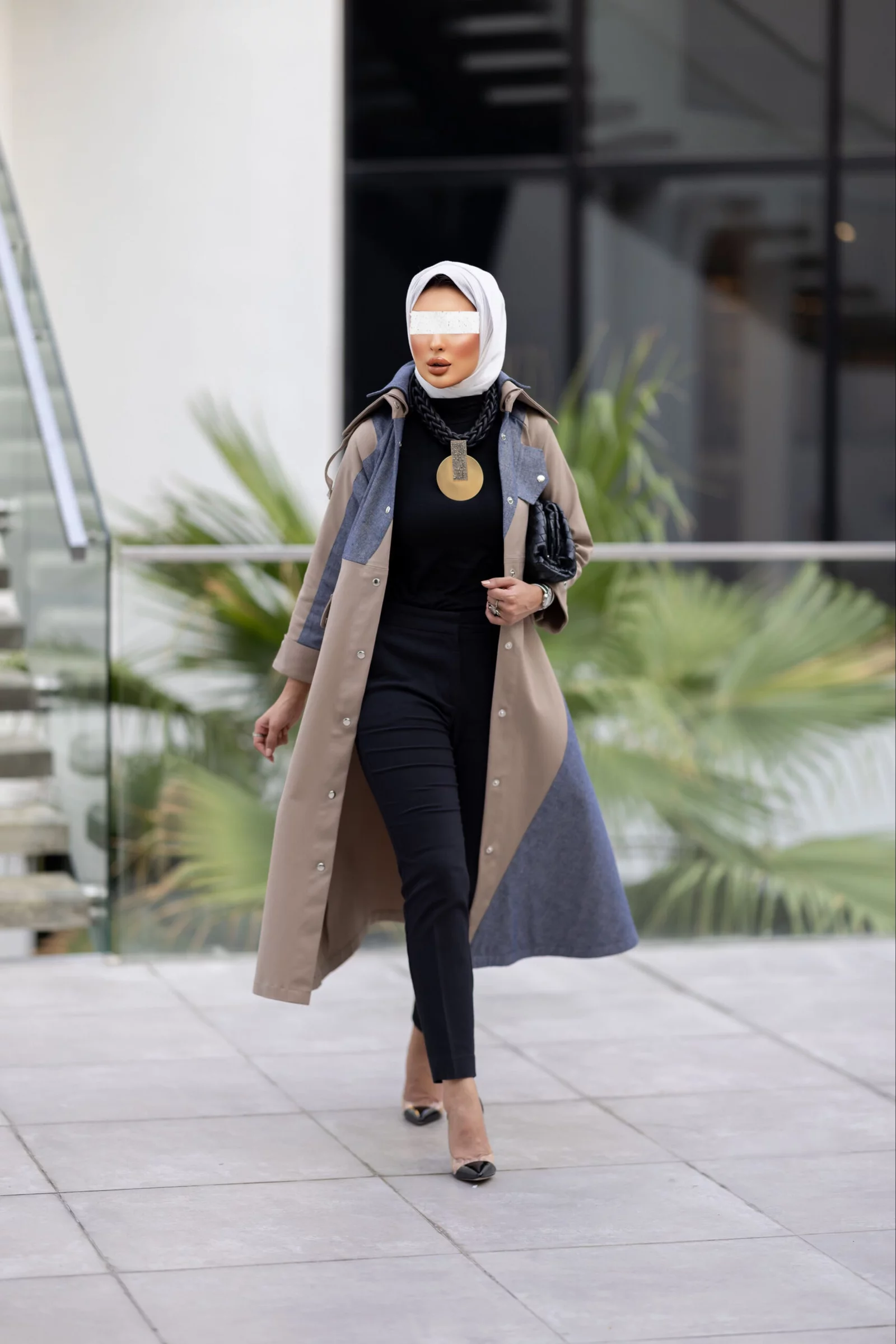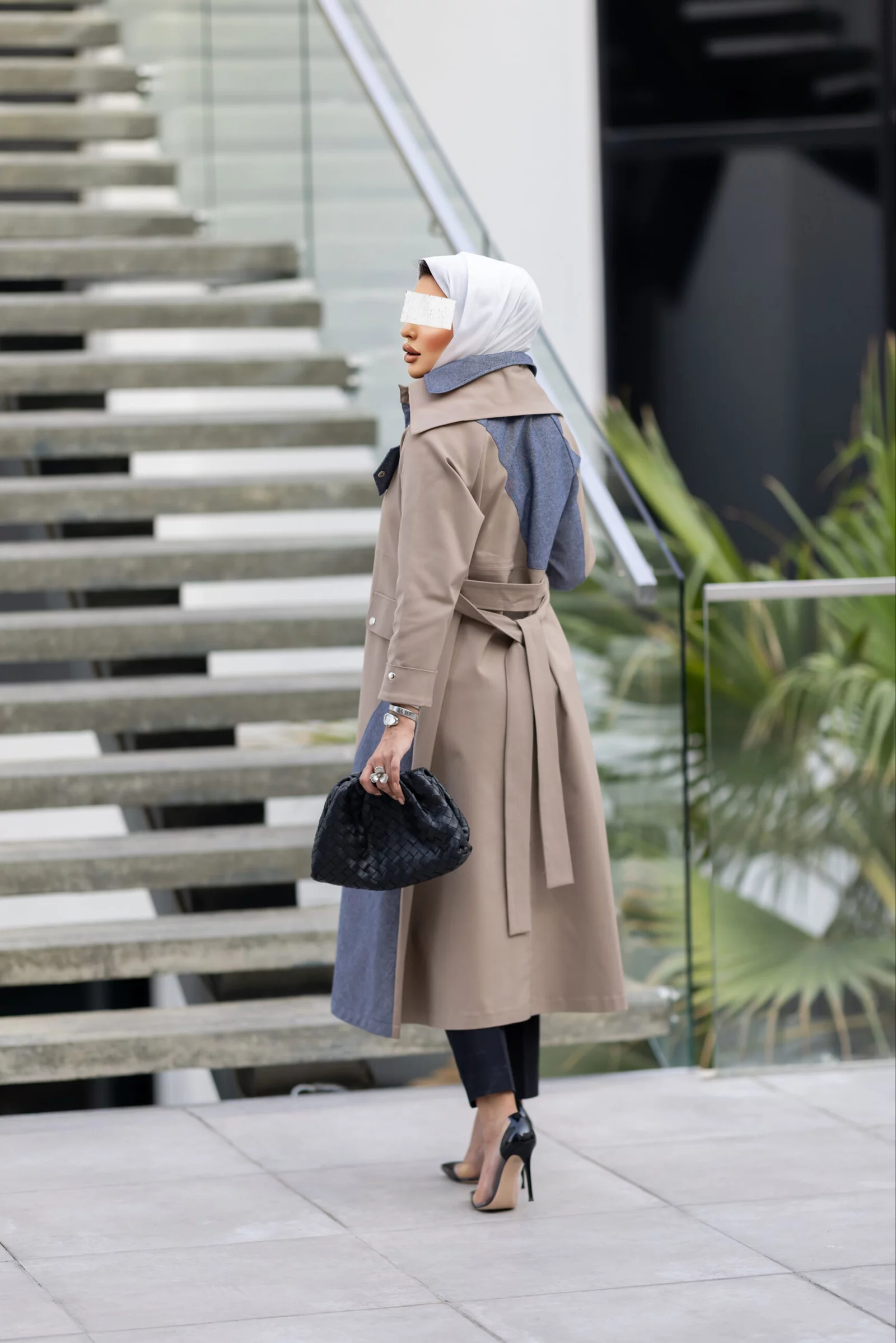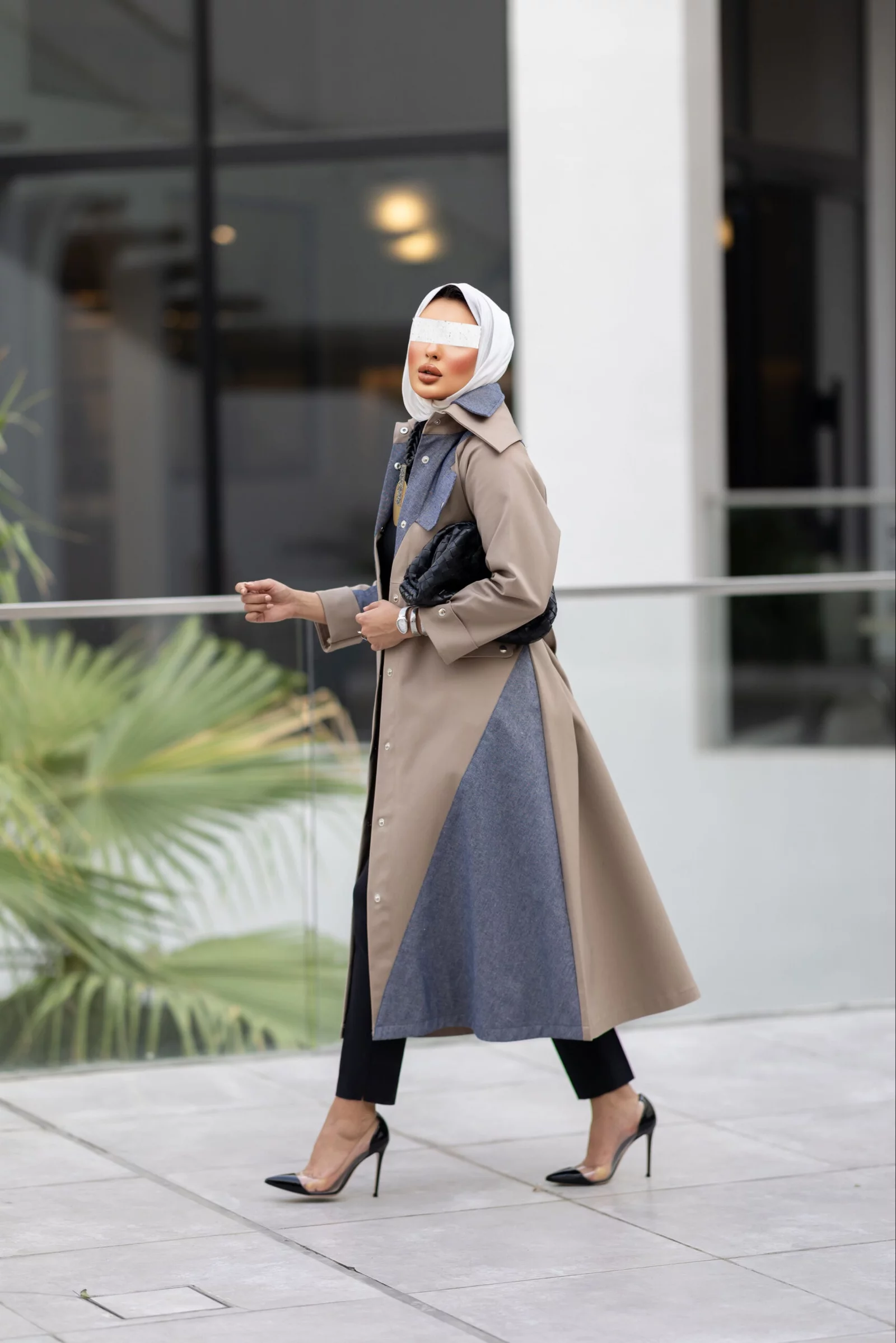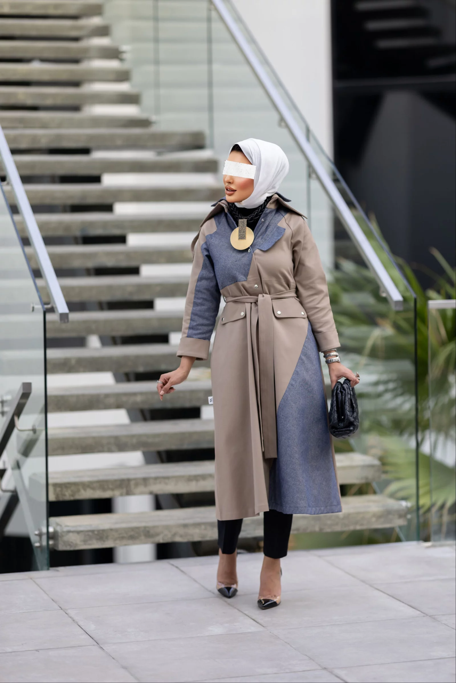 Long trench coat, black-gray color, with a belt, you can choose the length