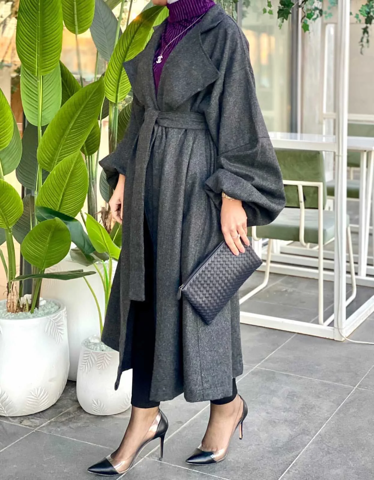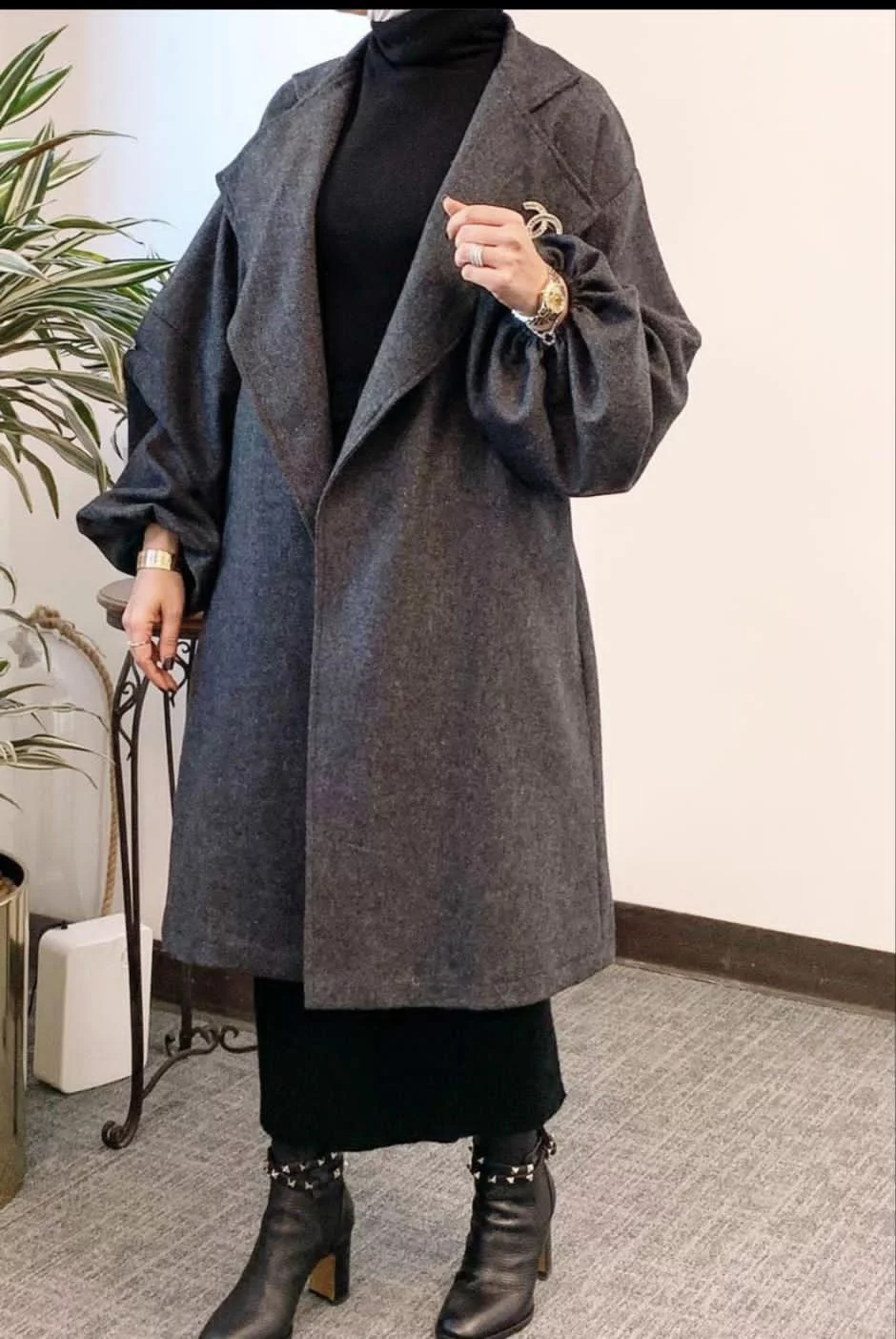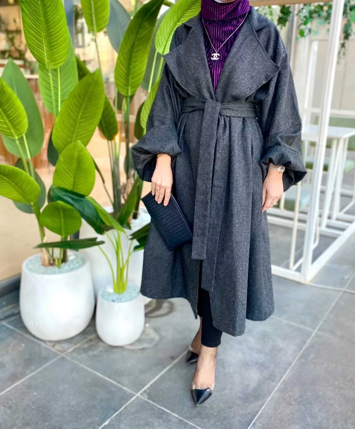 Long trench coat, black-gray color, with a belt, you can choose the length