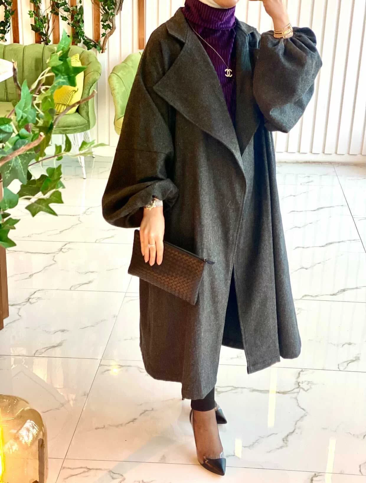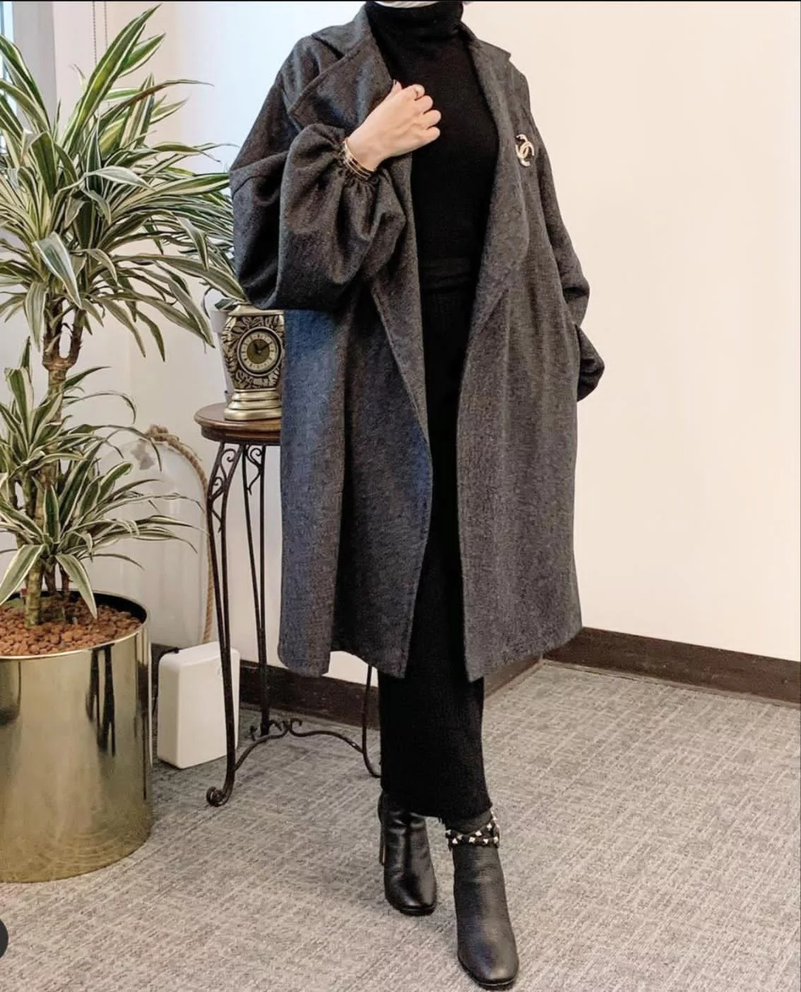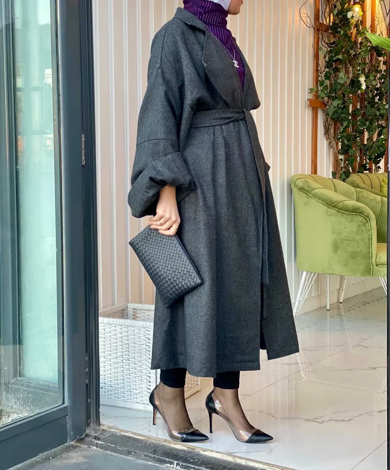 Long trench coat, black-gray color, with a belt, you can choose the length