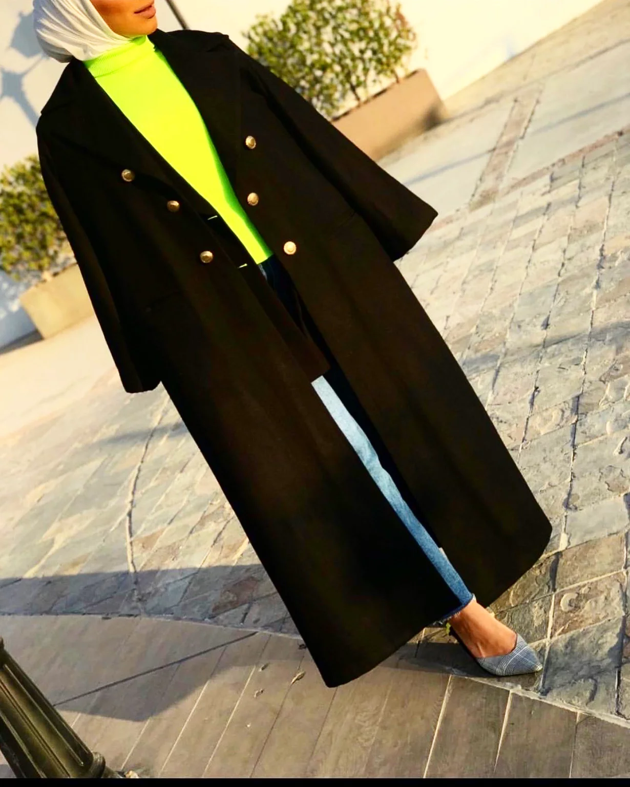Long trench coat, black-gray color, with a belt, you can choose the length