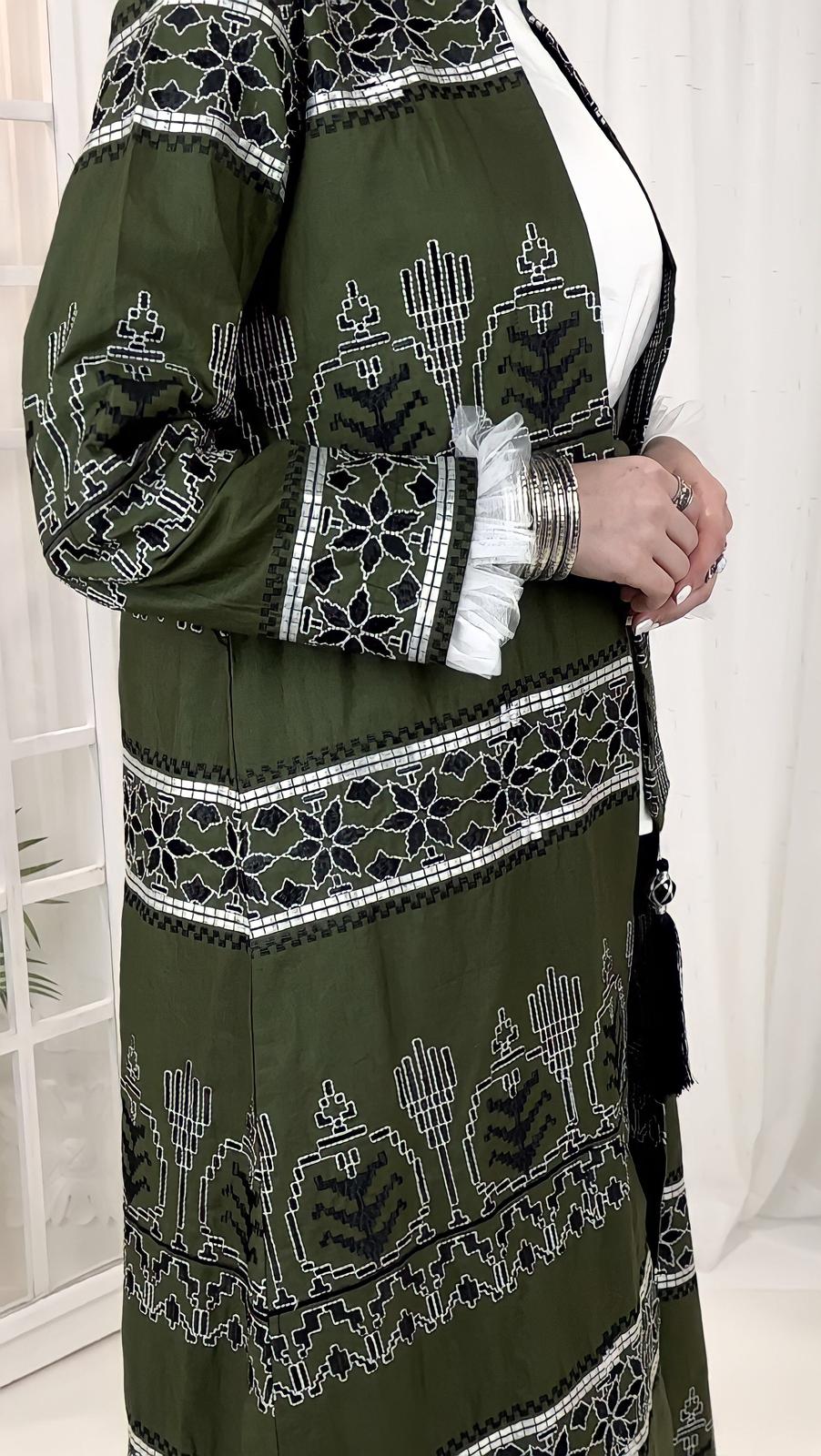 The piece consists of 4 pieces of embroidered bisht with a tour, a top and pants with a belt. Available in different colors