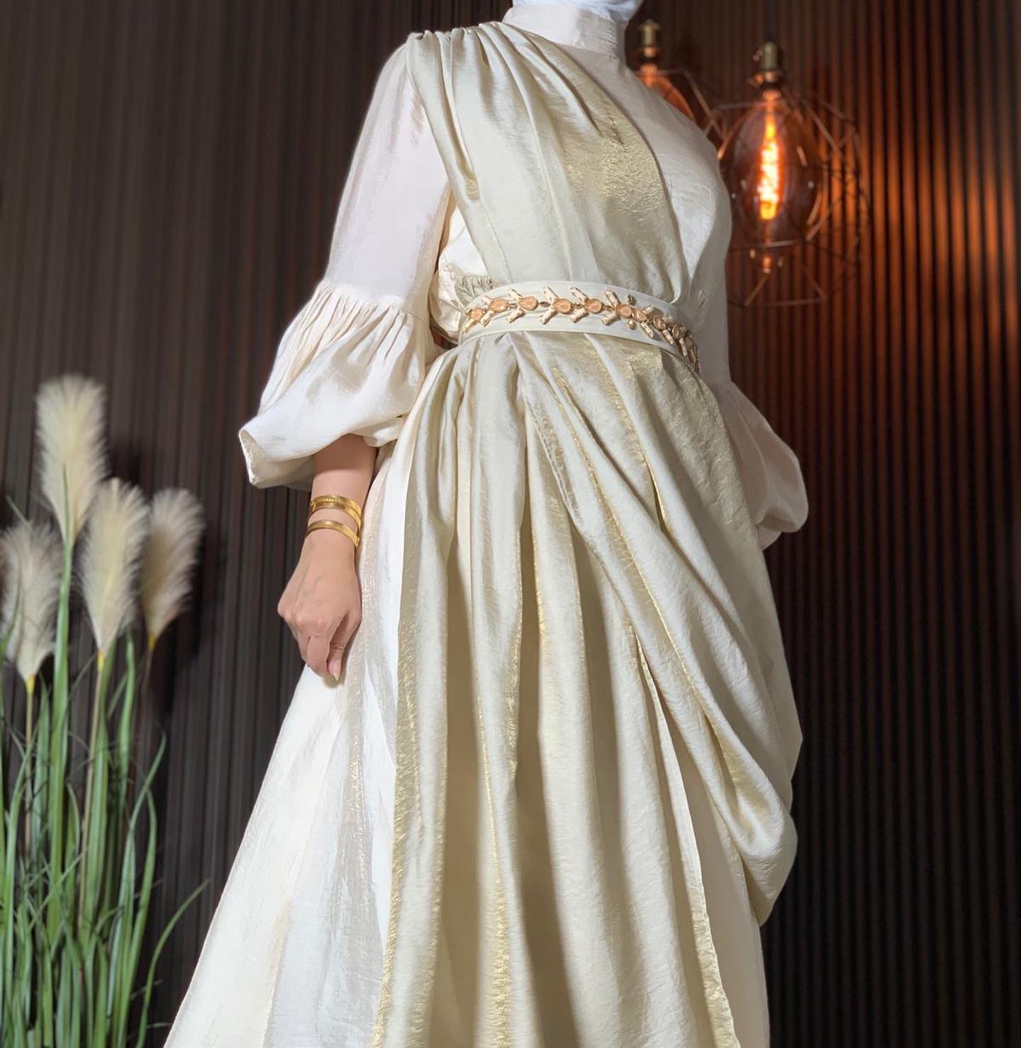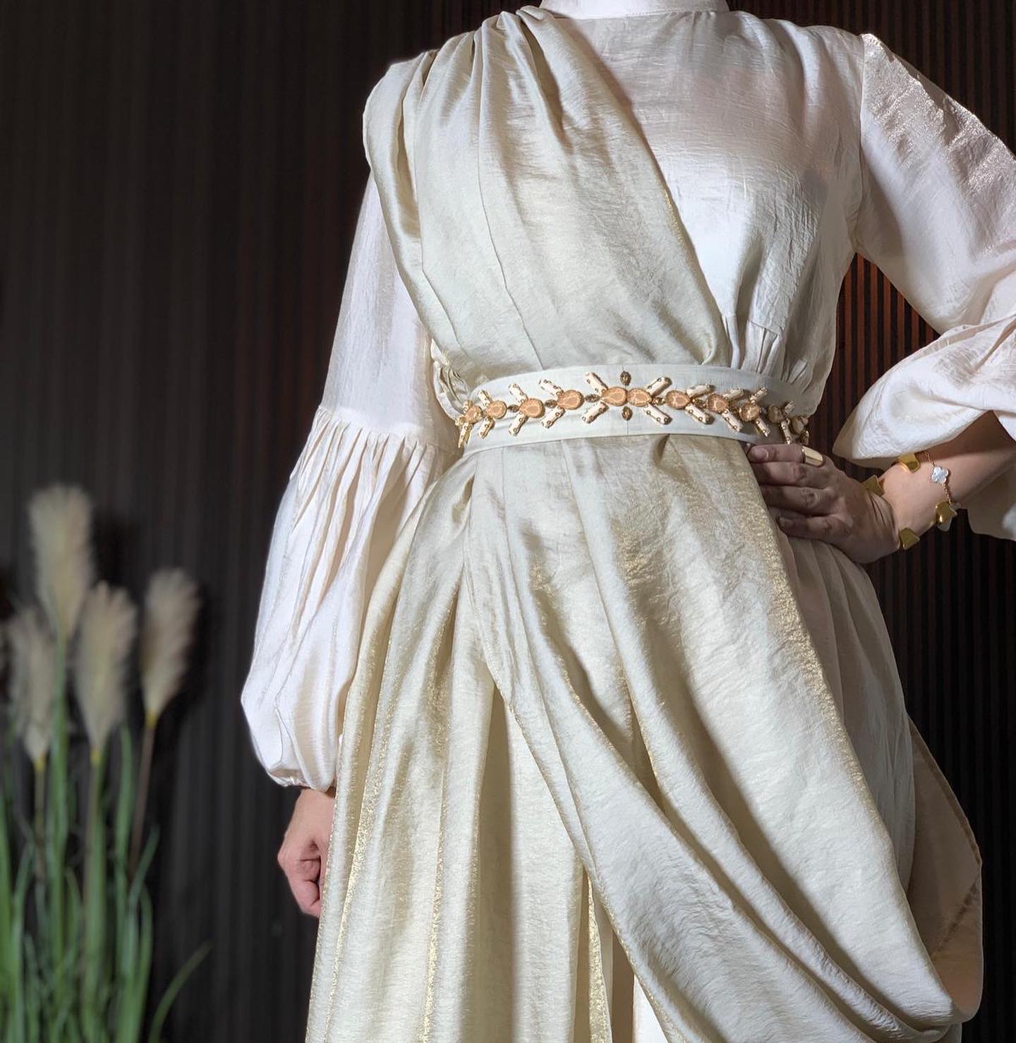 A suit that you can wear in more than one way. It consists of two pieces, with a tour dress and a belt