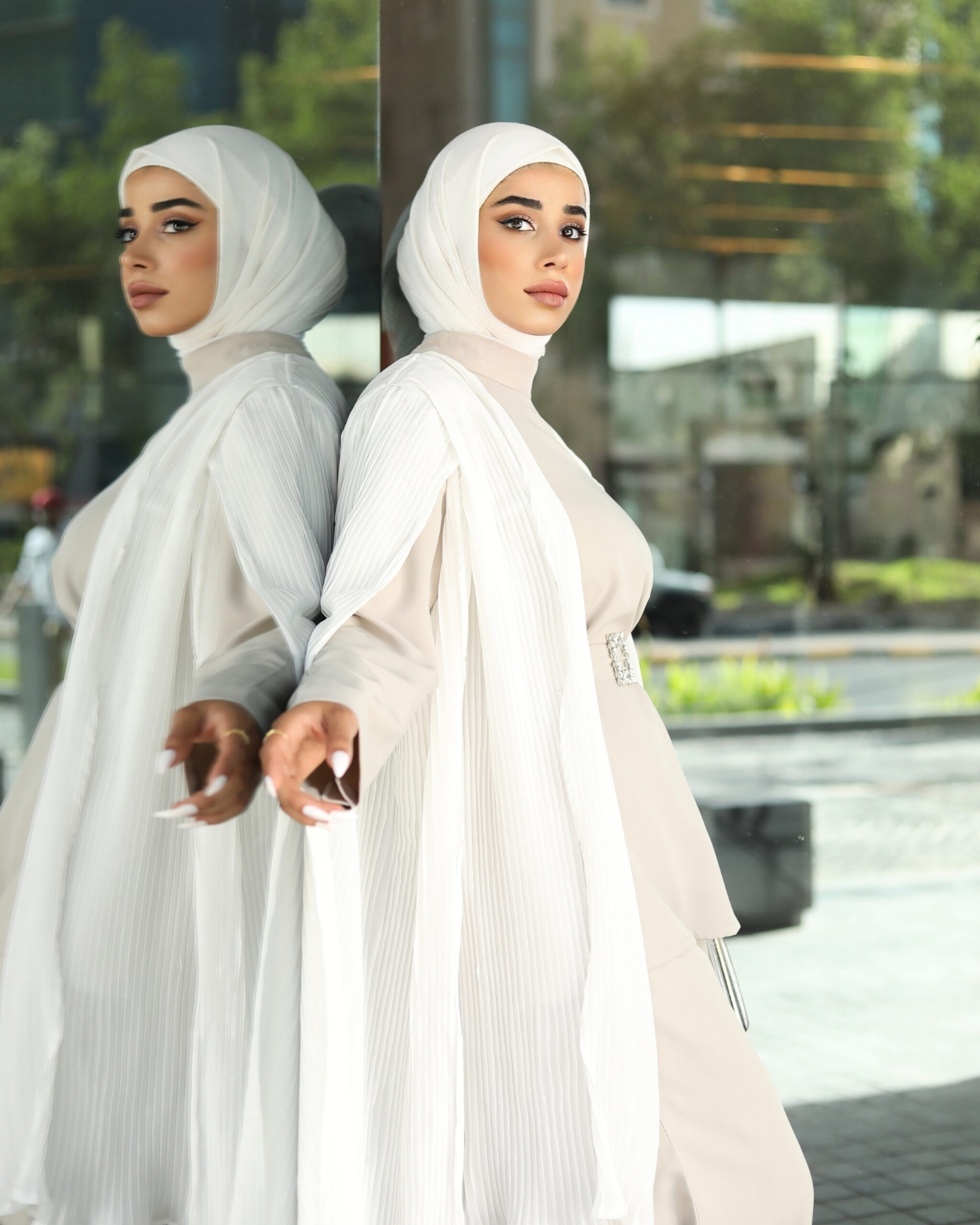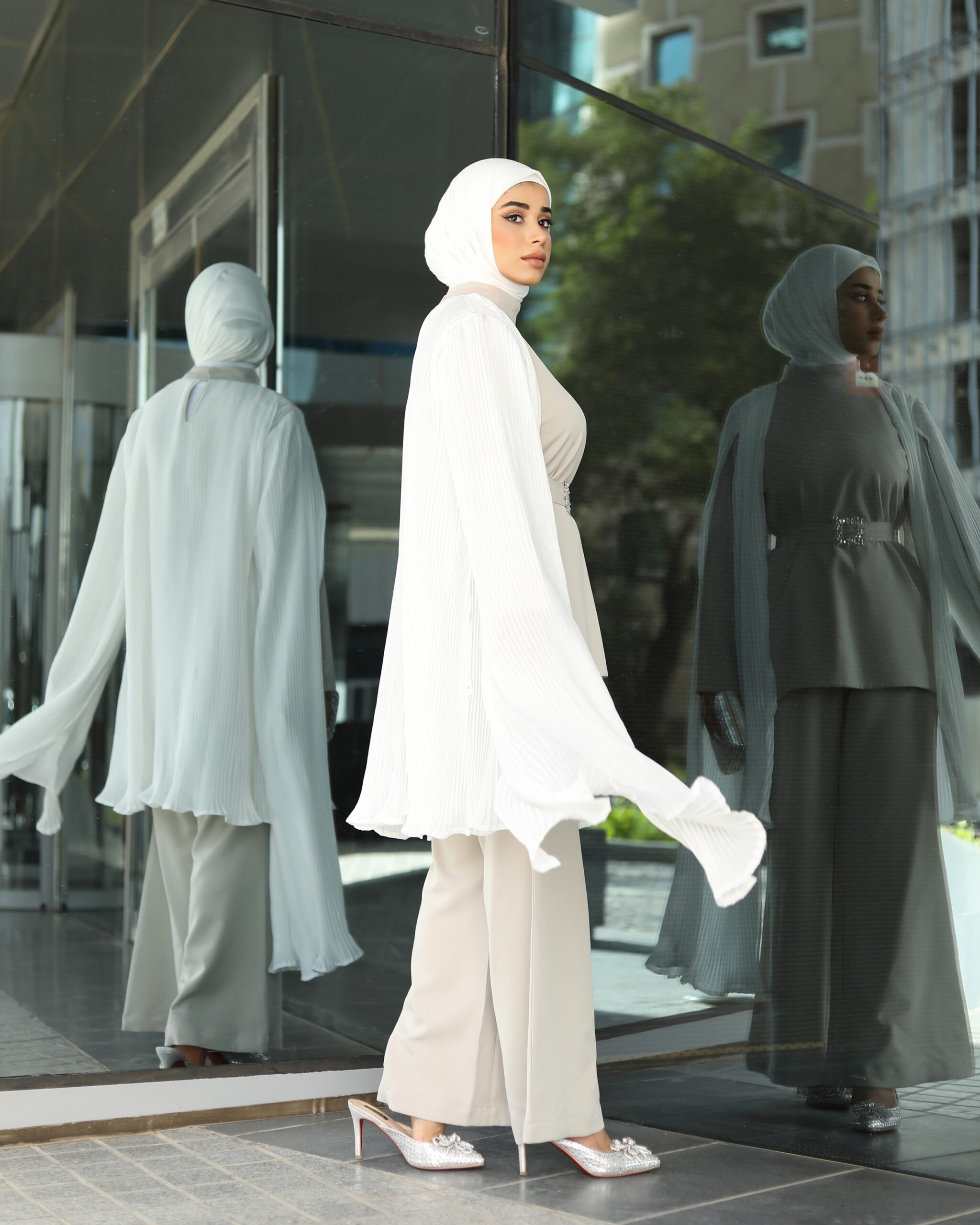A 3-piece suit with a belt. You can choose a dress or pants. Available in two colors