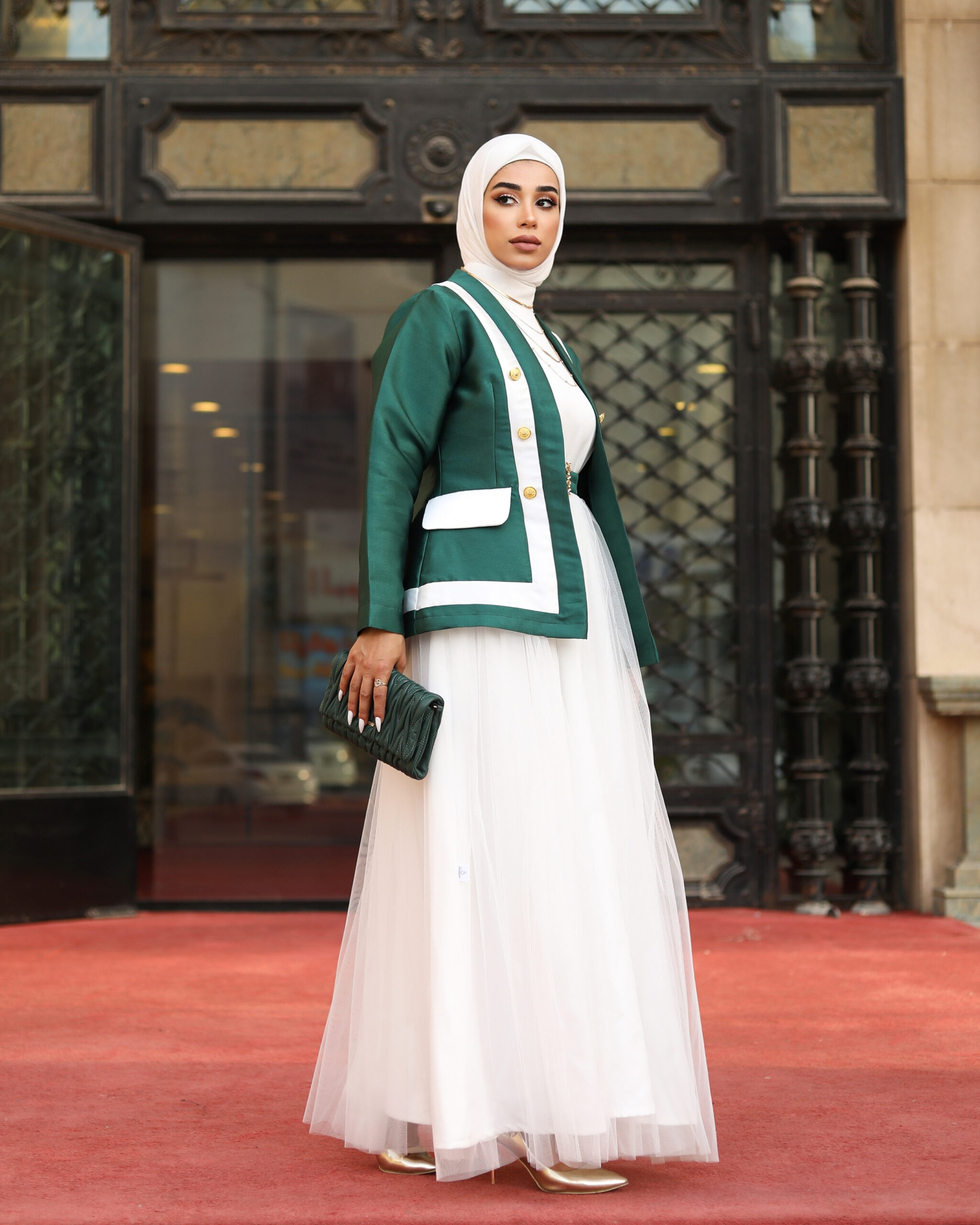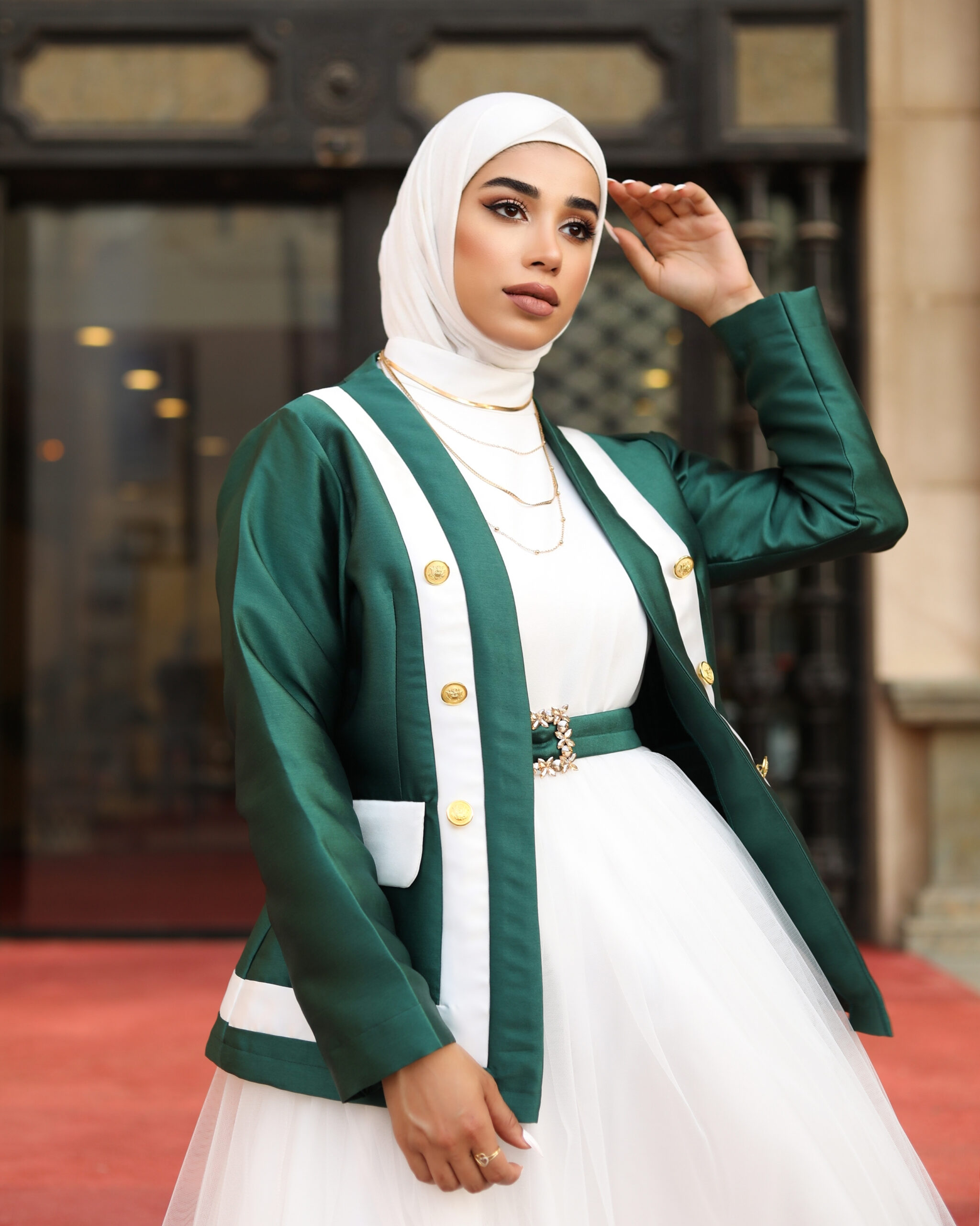 A suit of 3 pieces, jacket, top, and skirt, with a crystal belt, available in two colors