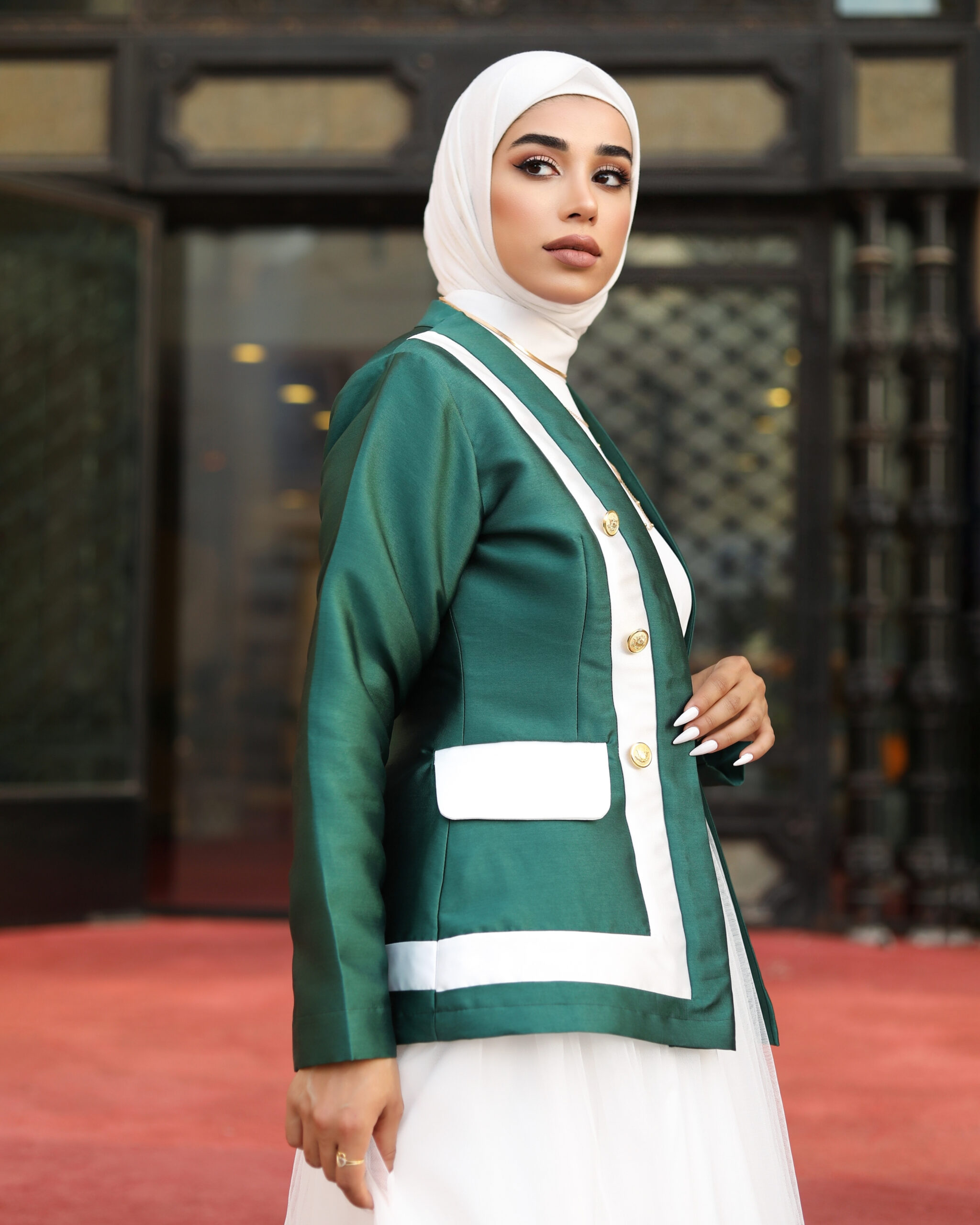 A 3-piece suit with a belt. You can choose a dress or pants. Available in two colors
