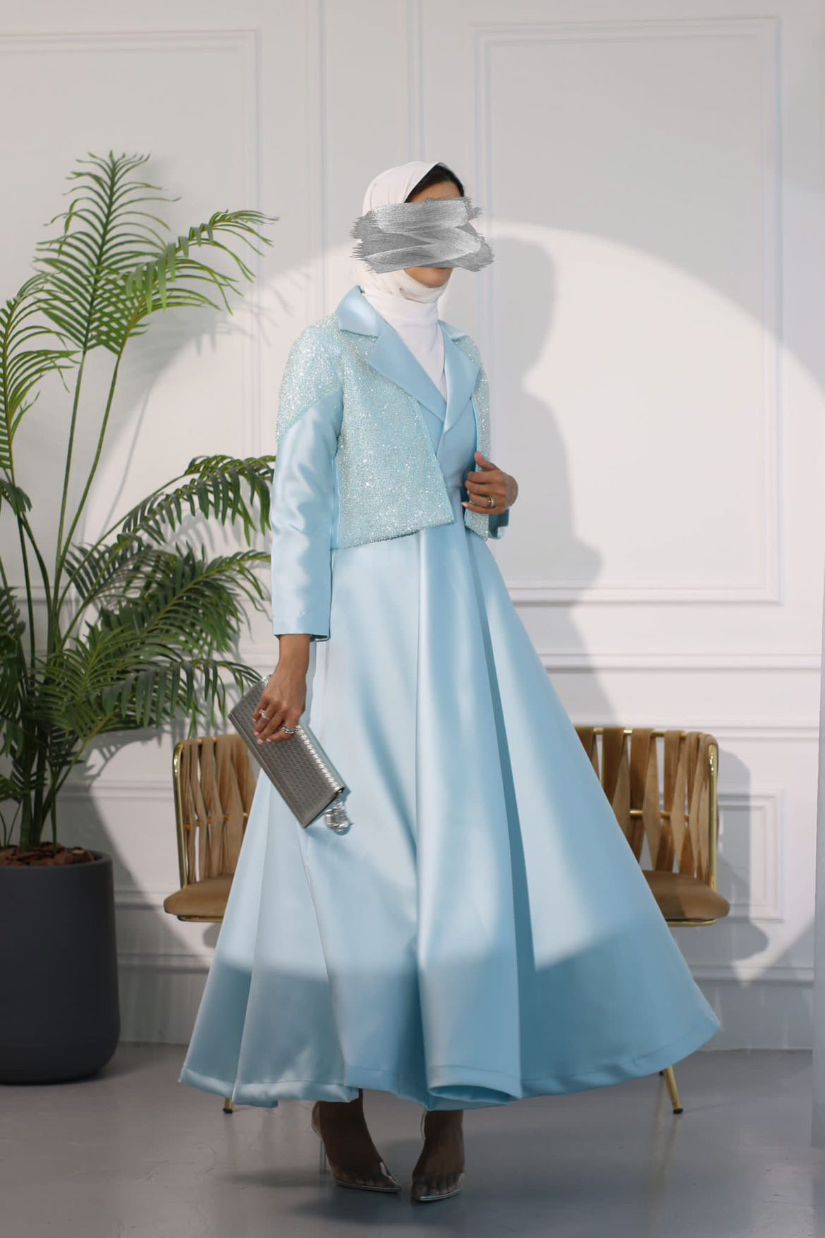 A suit of 3 pieces, jacket, top, and skirt, with a crystal belt, available in two colors