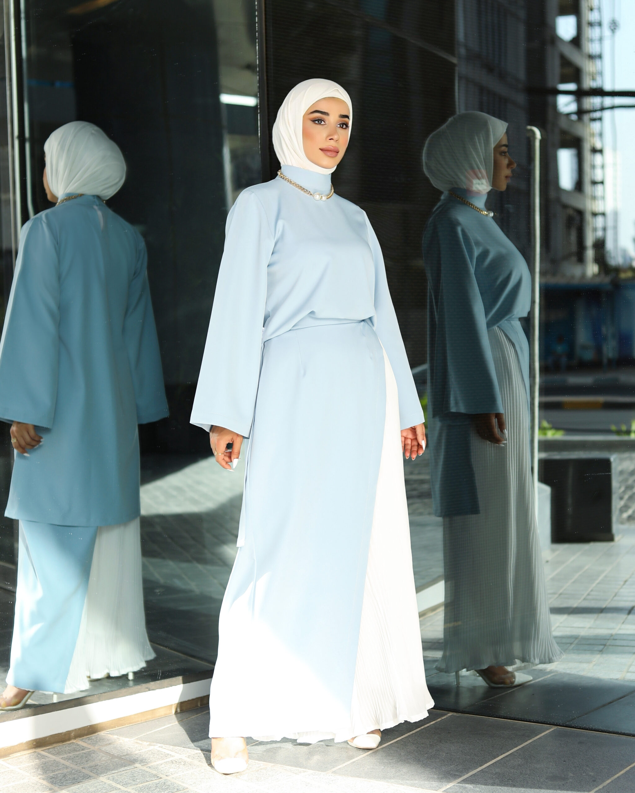 A 3-piece suit with a belt. You can choose a dress or pants. Available in two colors