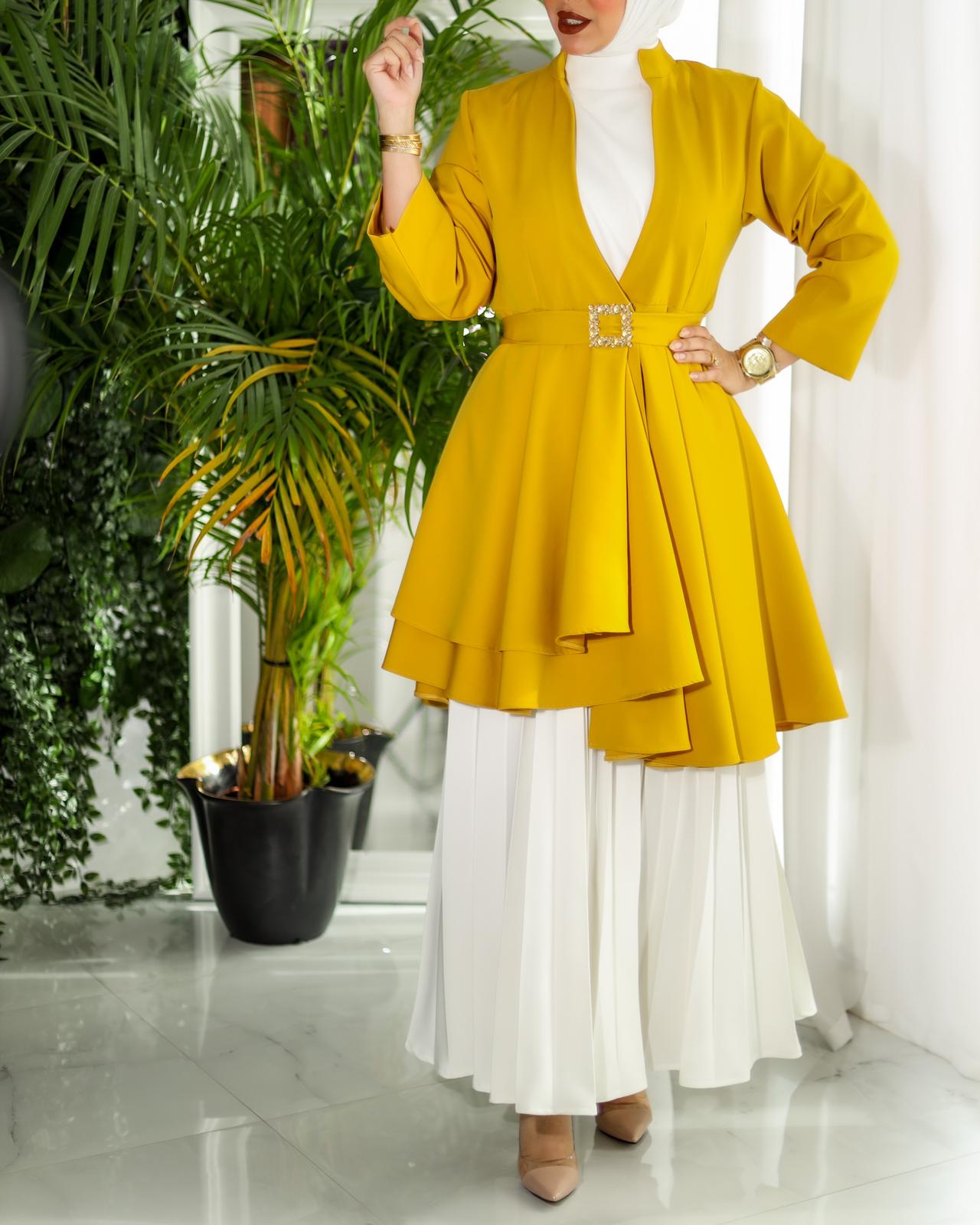 A 3-piece suit with a belt. You can choose a dress or pants. Available in two colors