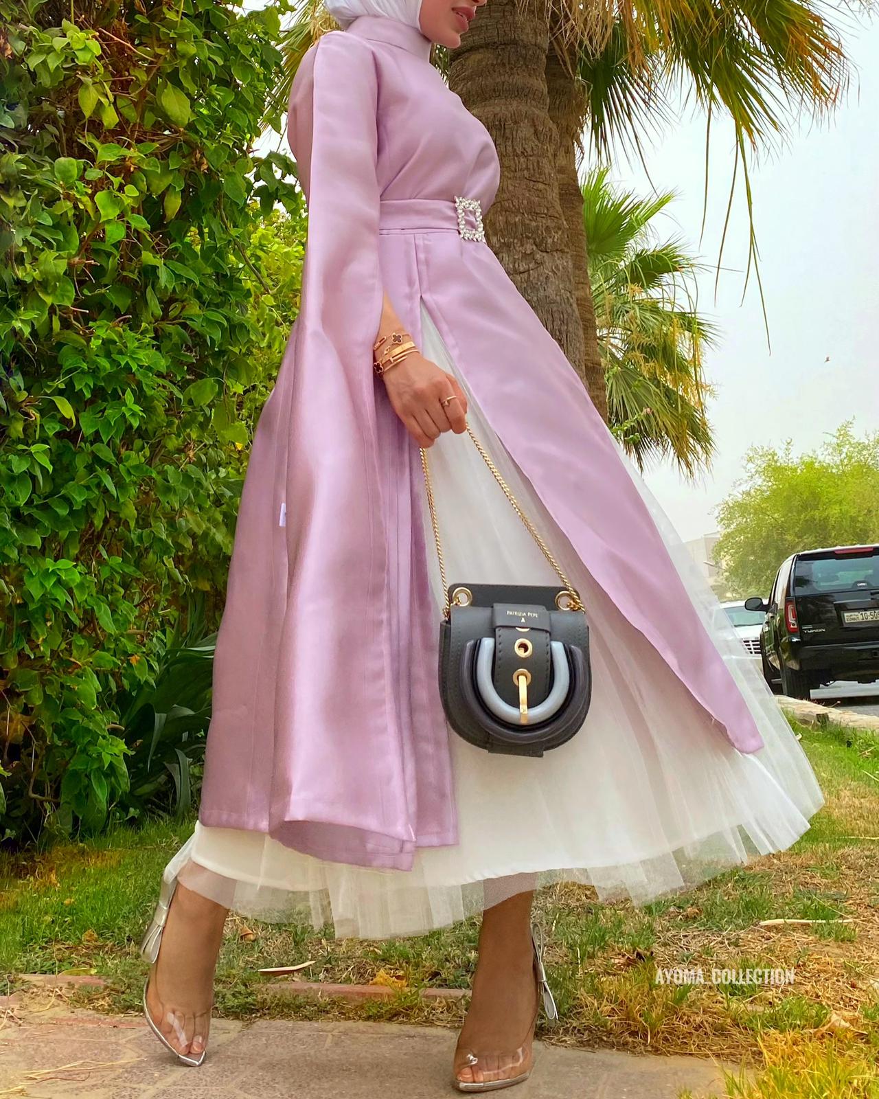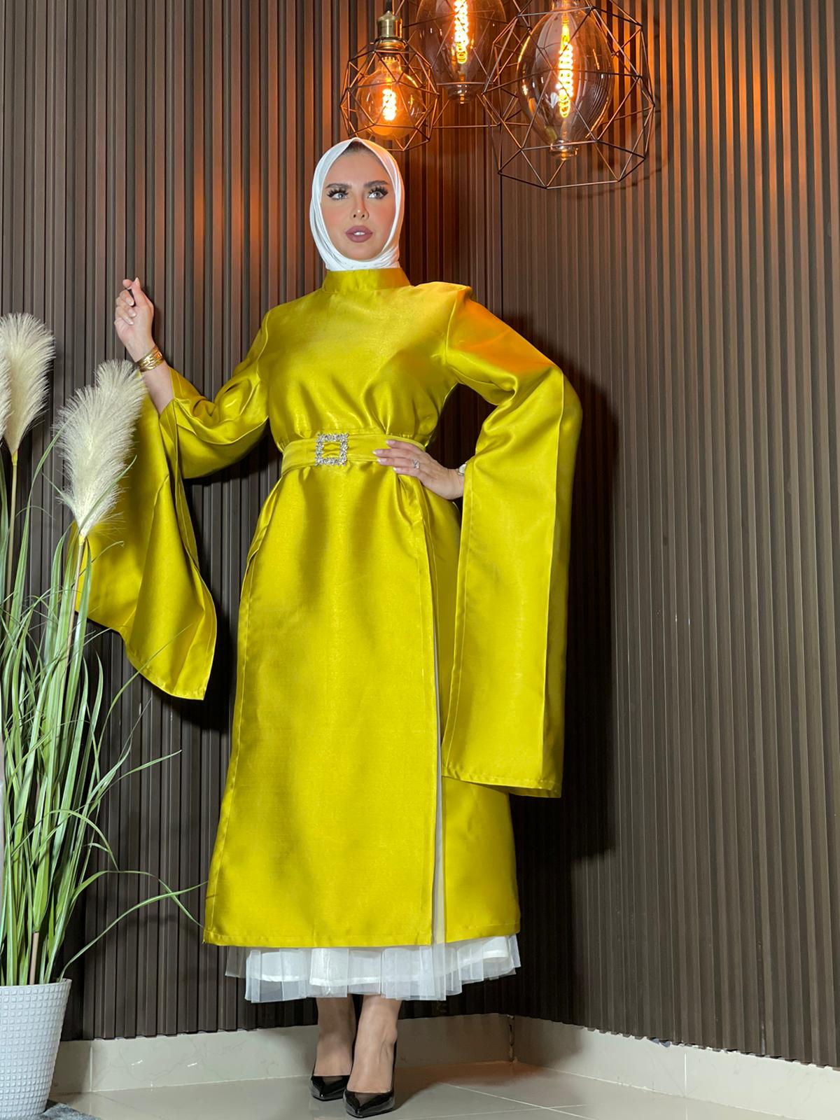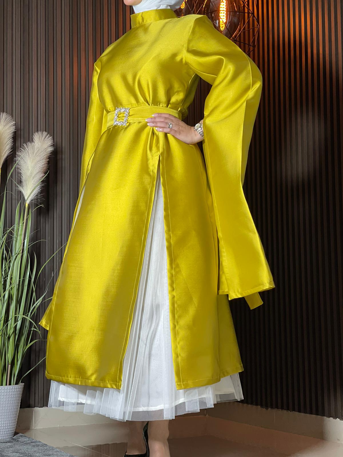 A 3-piece suit with a belt. You can choose a dress or pants. Available in two colors