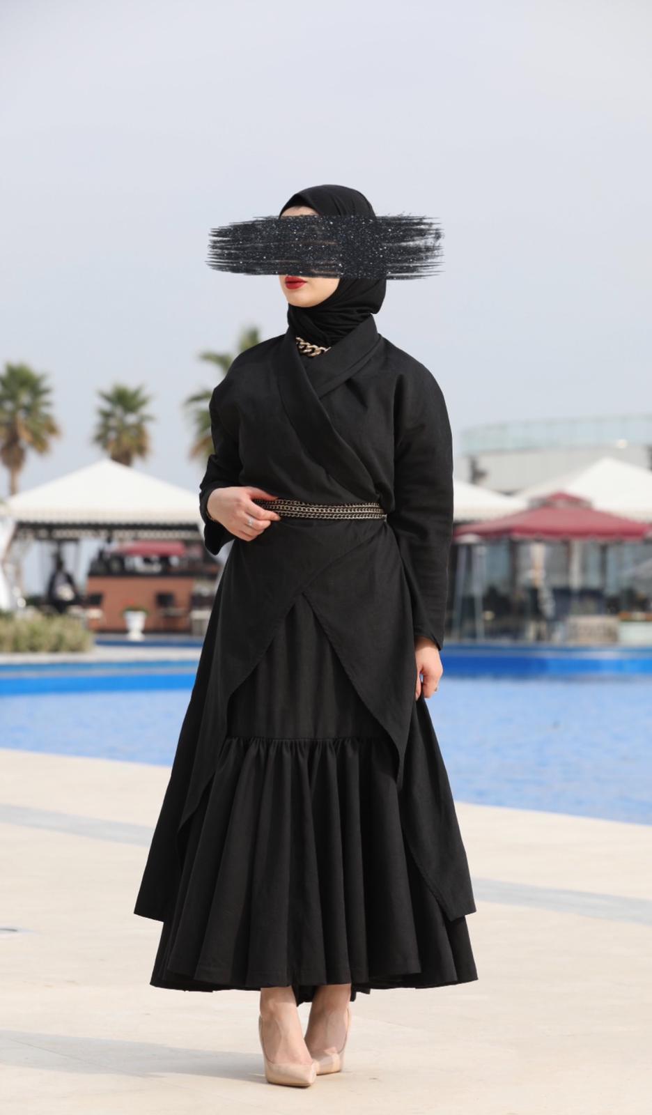 A 3-piece suit with a belt. You can choose a dress or pants. Available in two colors