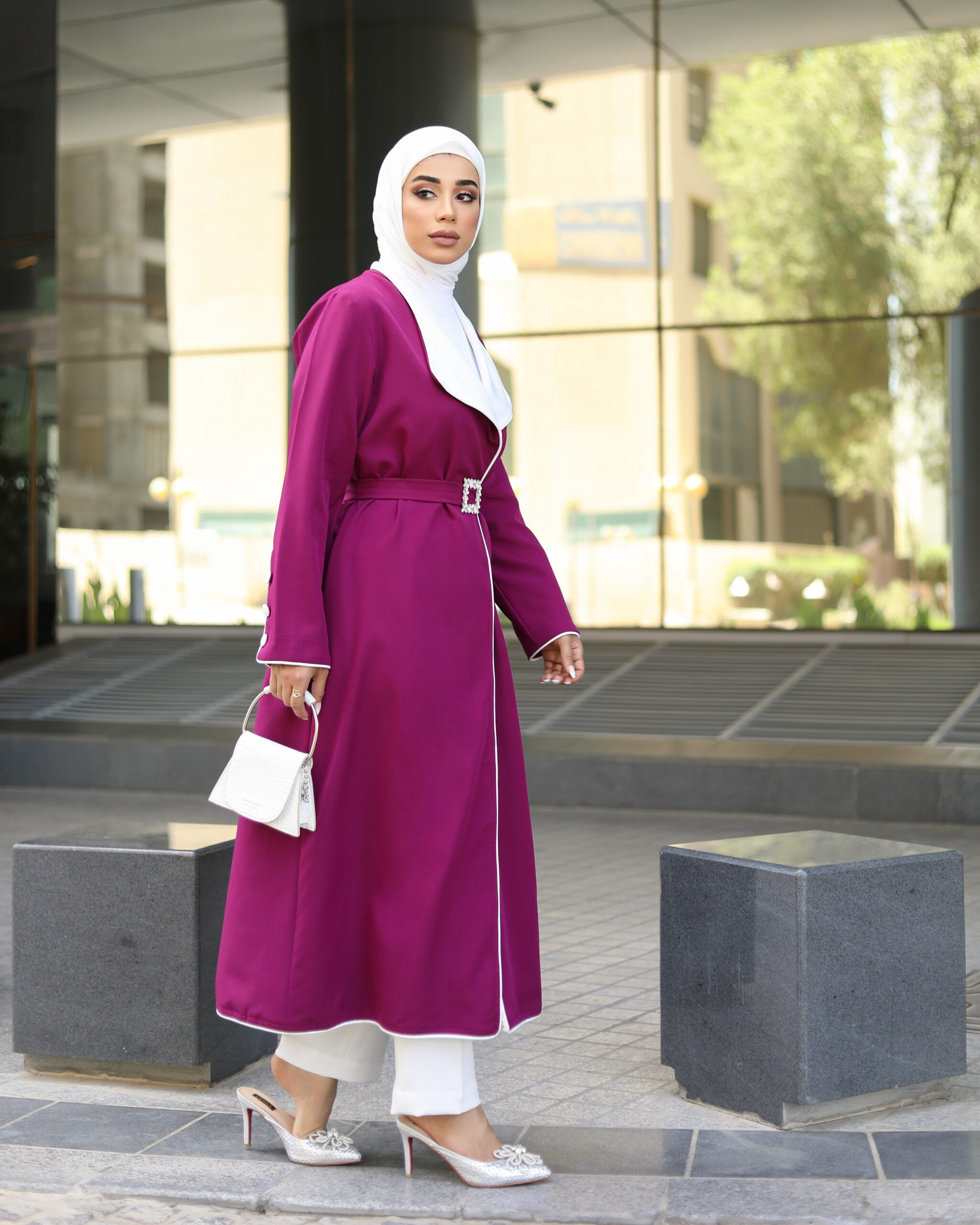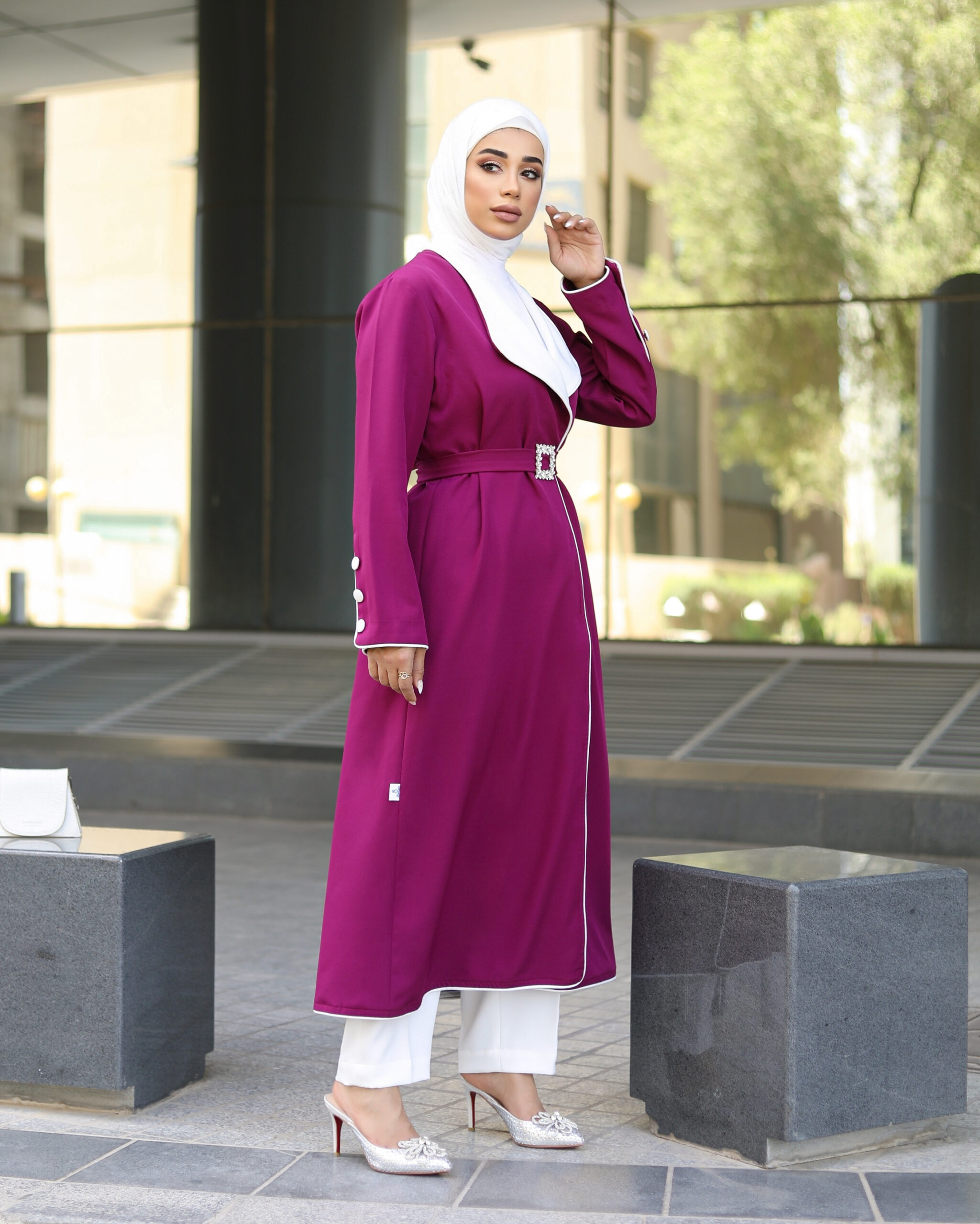 A 3-piece suit with a belt. You can choose a dress or pants. Available in two colors
