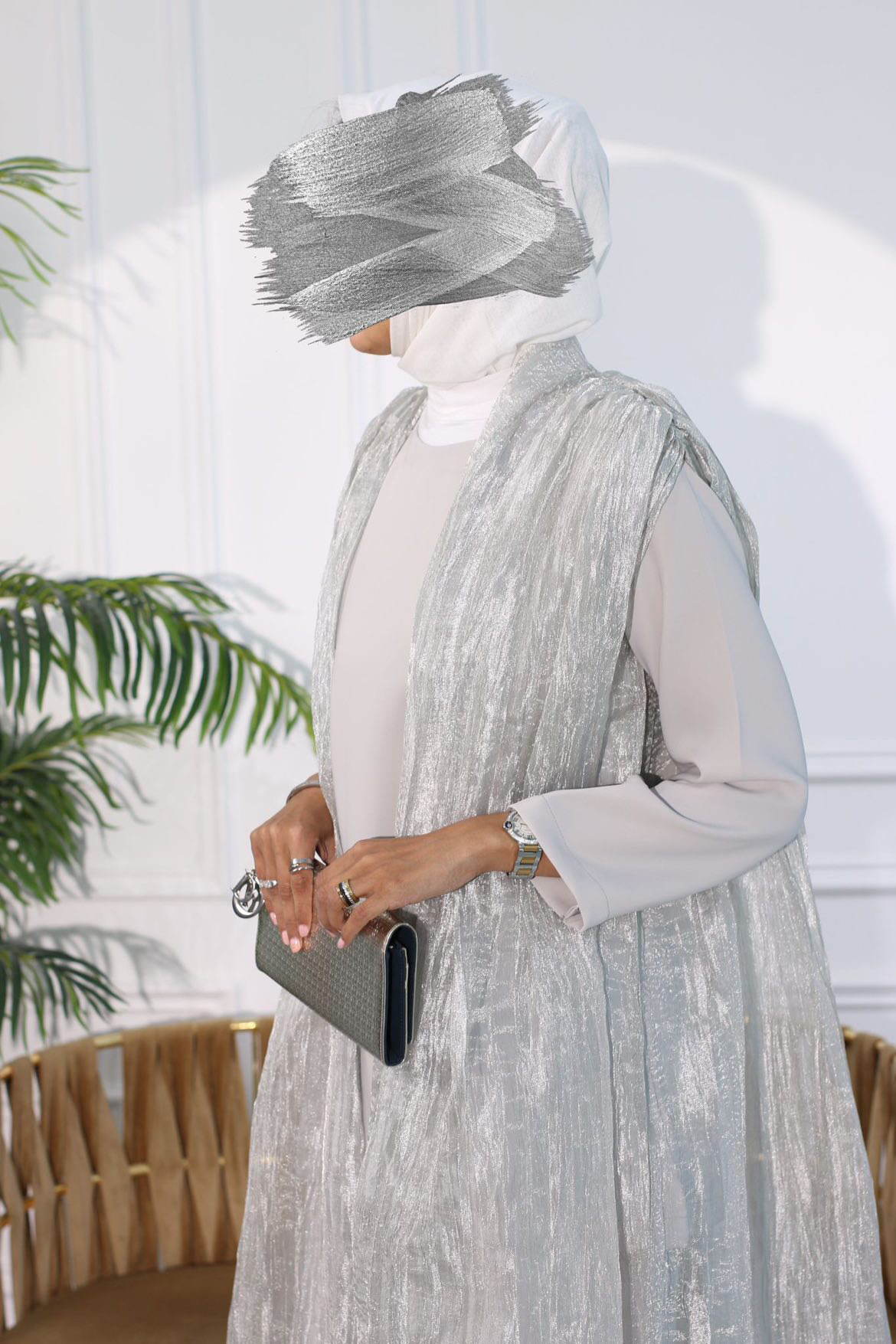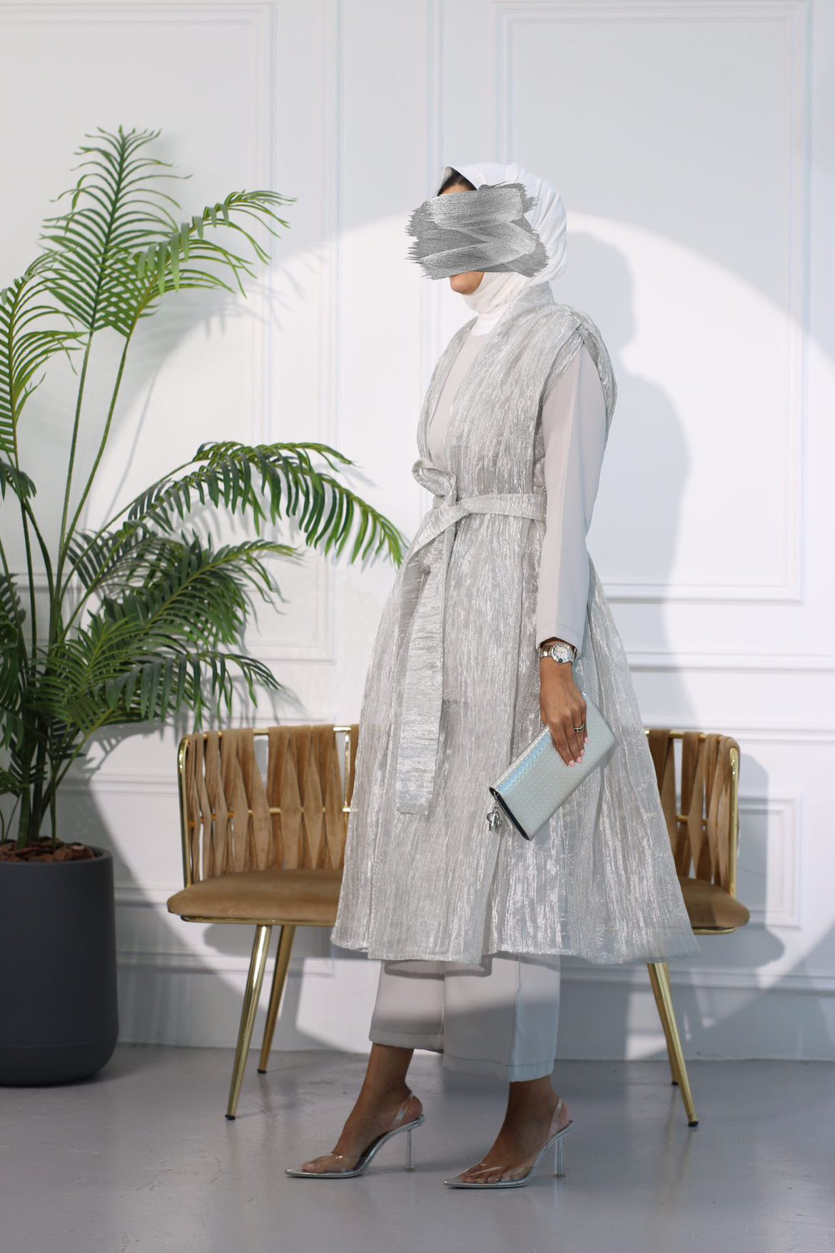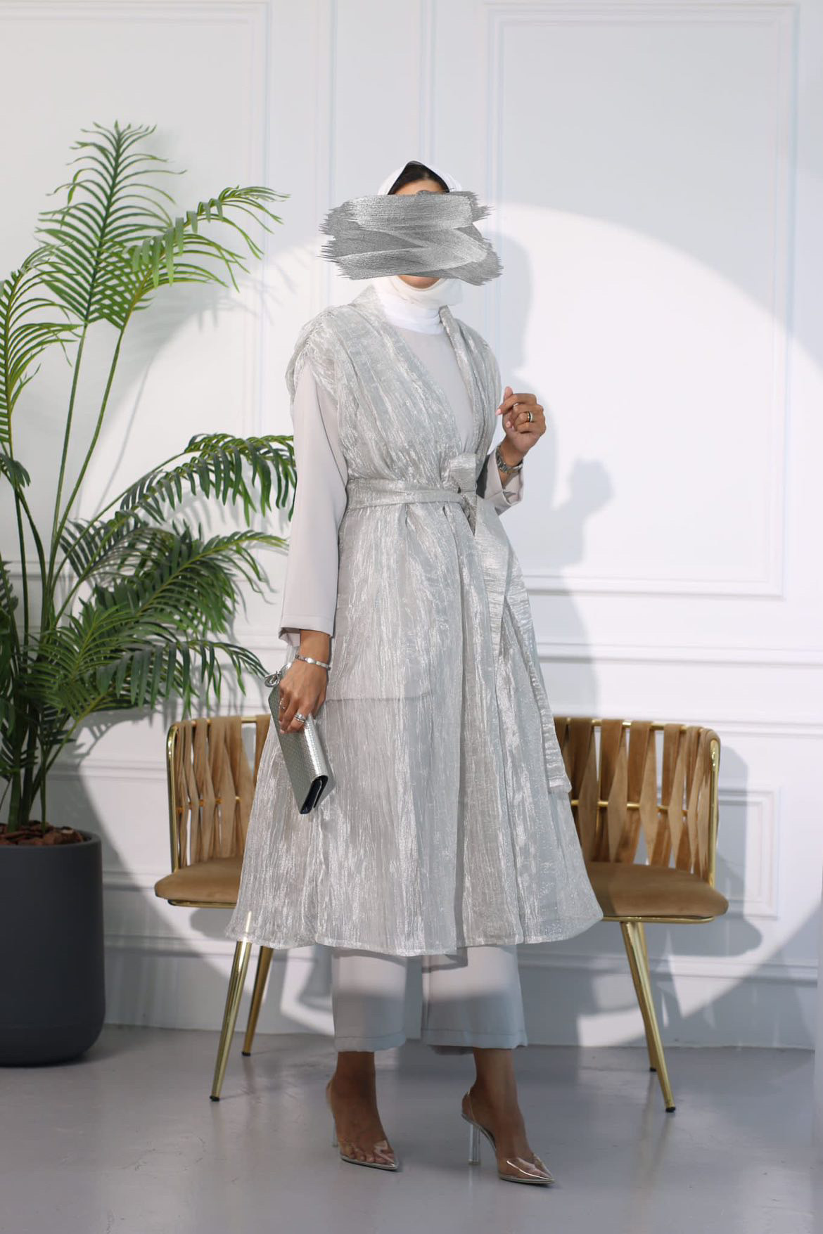 A 3-piece suit with a belt. You can choose a dress or pants. Available in two colors