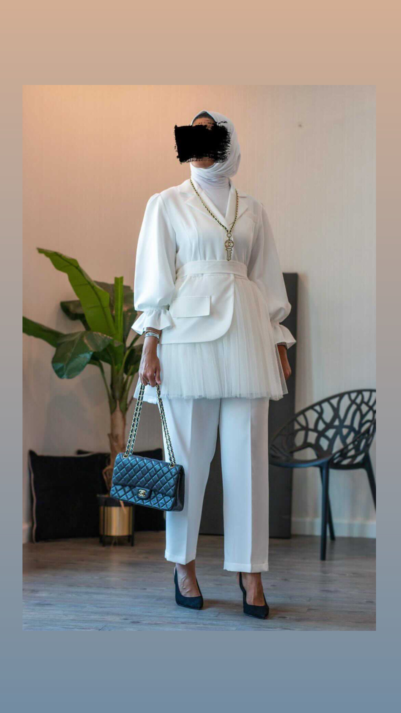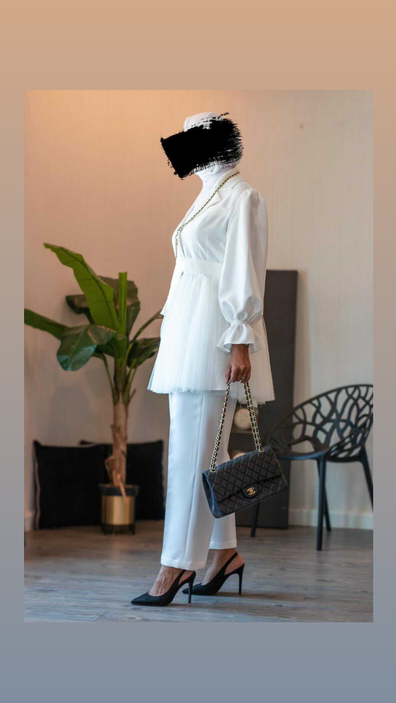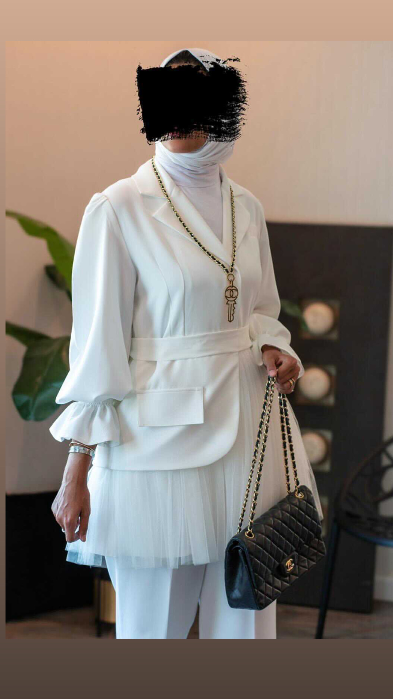 A 3-piece suit with a belt. You can choose a dress or pants. Available in two colors